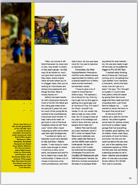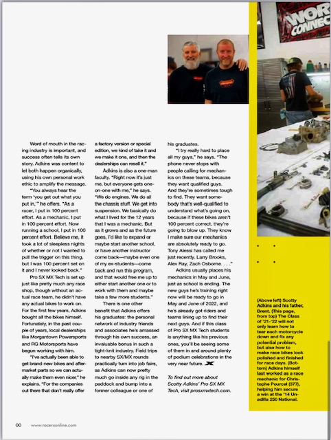 Racerxonline January 2022 issue completed an amazing article on Pro SXMX Tech and instructor Scott Adkins! Amazing results coming out of Pro SX MX Tech! The industry is full of mechanics that trained here and are now living their dream! All it takes is hard work and dedication and Pro SXMX Tech can make your dream a reality!! The proof is in the results! See full article here: